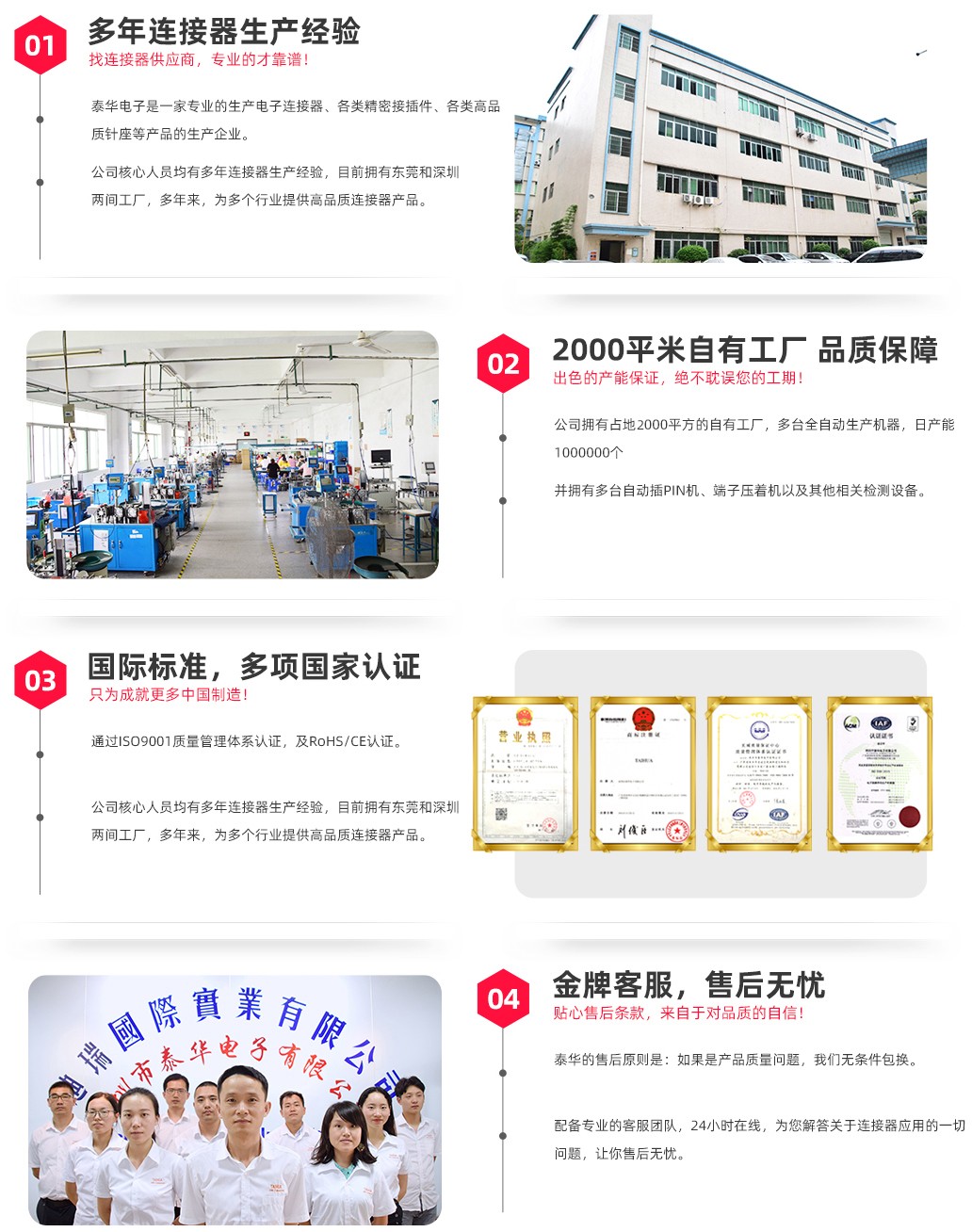 深圳市泰華電子有限公司15年專注連接器,多來成功為全國2000家大中小型企業提供專業的技術和服務。本公司具備先進的生產設備,標準化生產流程接插件日產100萬。所有產品通過ISO9001、ROHS等認證,自成立以來一直秉承品質為先,客戶至上的理念。